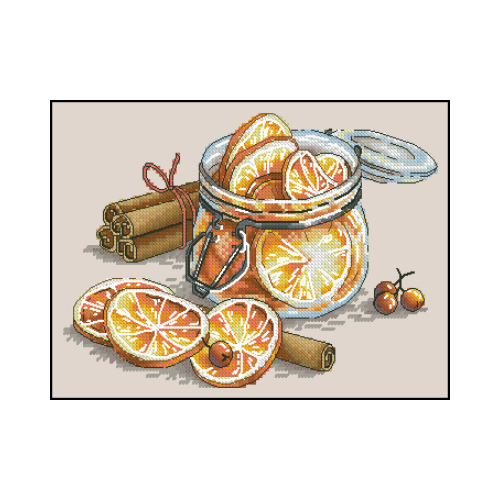Naranja y canela es un patrón o esquema en punto de cruz, perfecto para decorar cualquier rincón de tu cocina.